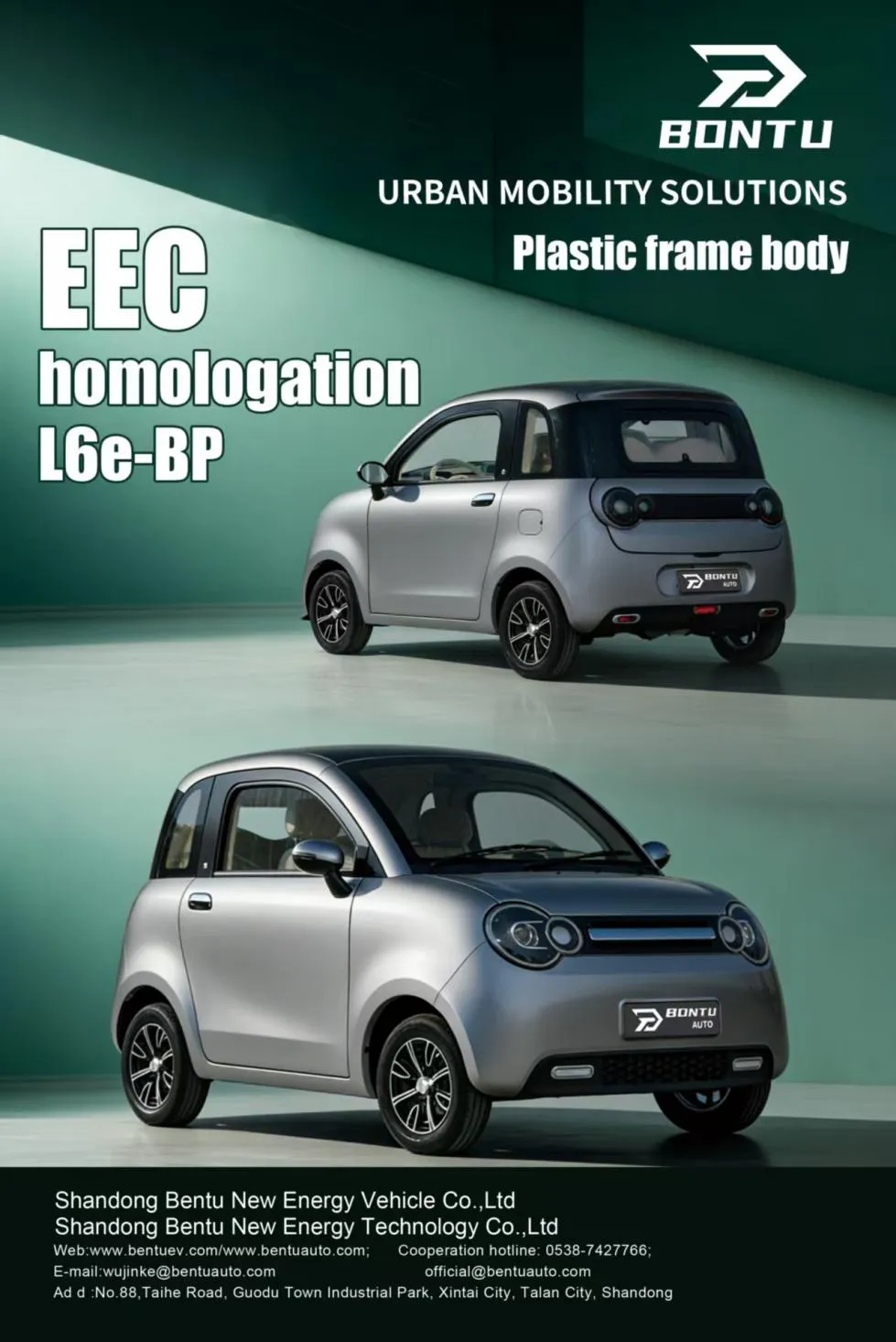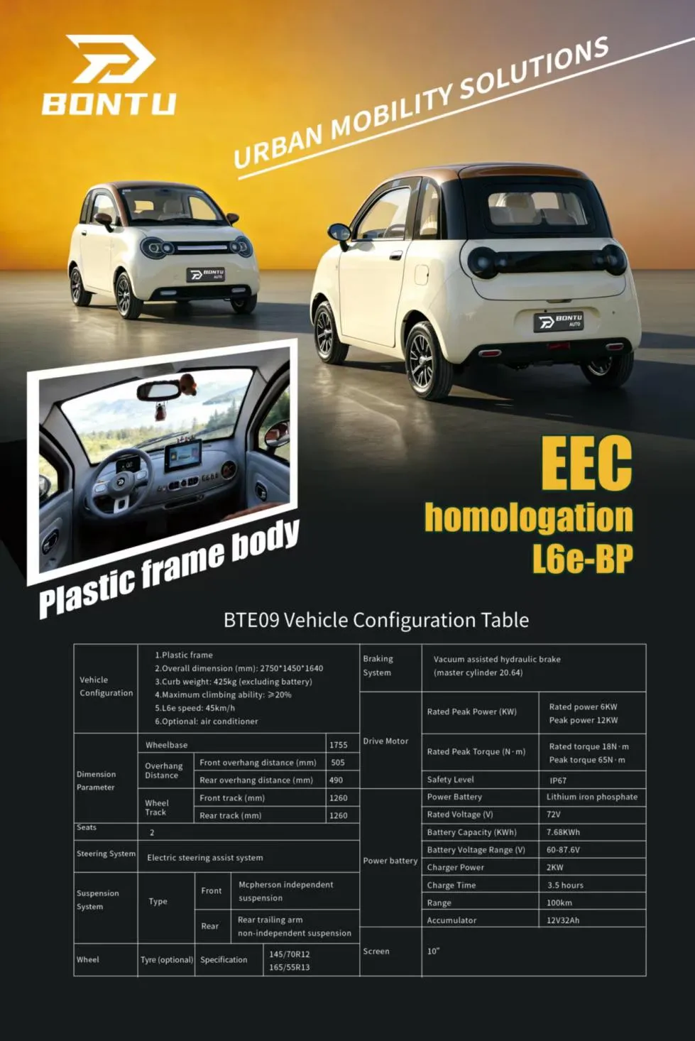 Shandong Bentu New Energy Vehicle Industry Co., Ltd.는 도시 여행을 위한 다양하고 효율적인 솔루션을 제공하는 새로운 BTE 09 MINI 승용차를 시장에 출시할 예정입니다. 내구성이 뛰어난 플라스틱 프레임으로 설계된 이 소형 차량은 2750mm * 1450mm * 1640mm 크기로 좁은 거리, 혼잡한 도심 지역, 좁은 주차 공간에 이상적입니다. 컴팩트한 크기는 성능을 저하시키지 않습니다. 등반 경사도가 20%이므로 지하 차고 경사로와 교외 지역을 쉽게 이동할 수 있습니다.